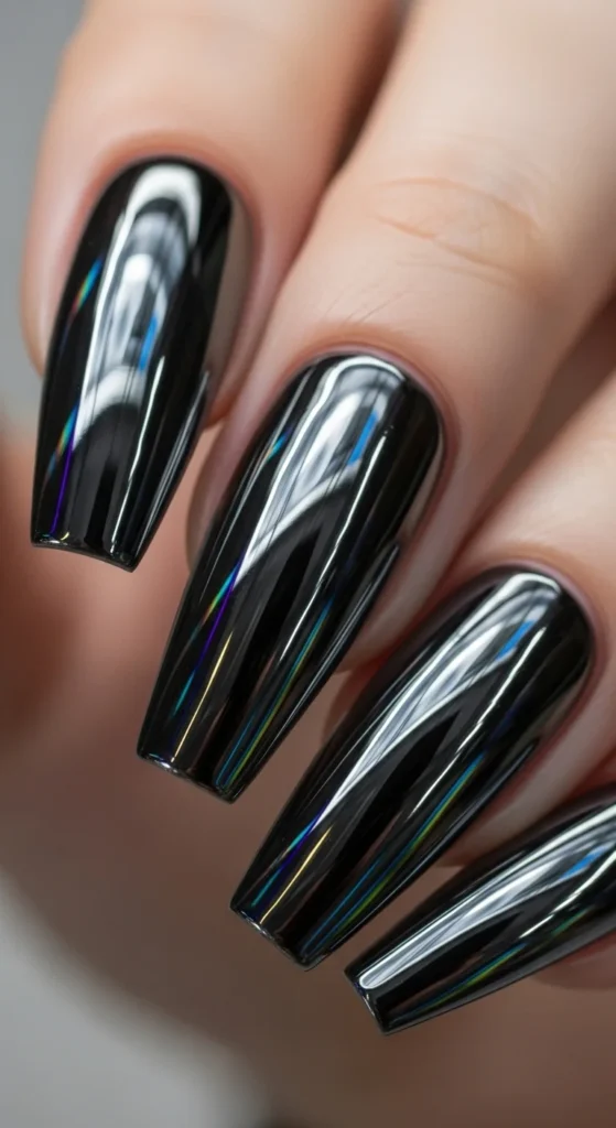 You can recreate this at home using affordable chrome powder kits over black gel polish. Rub the powder gently over cured polish and seal with a top coat. If full chrome feels too loud, apply chrome only on one or two nails while keeping the rest glossy black. This keeps the style balanced and easier to wear daily.