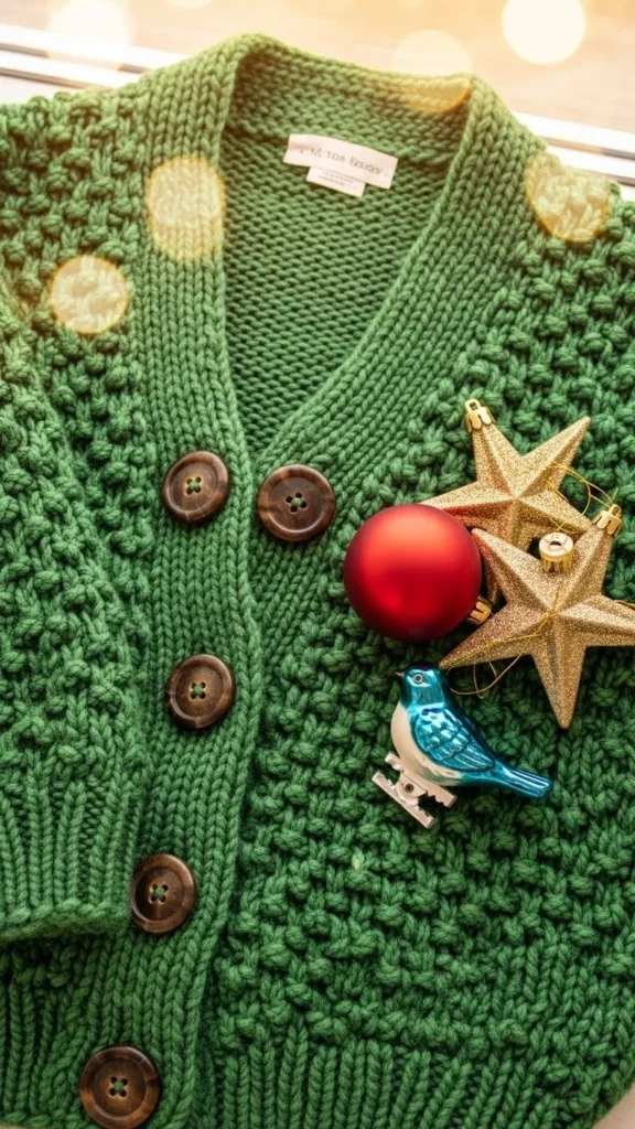 An oversized cardigan gives comfort and style in one piece. Choose green to match the holiday mood. Statement buttons add charm without needing extra accessories. Wear it over a simple tank or fitted top. Pair it with straight jeans or a black skirt for balance. If the cardigan feels too big, tuck one side into your waistband for shape. You can sew your own decorative buttons for a low-cost upgrade. Add a simple necklace to break the monotone look. Soft makeup and loose hair complete the vibe.
