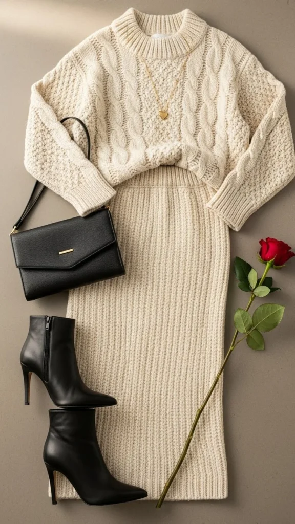A soft knit dress feels warm, flattering, and easy to wear for an evening date. The fabric stretches gently and moves with the body, making it comfortable for sitting and walking. Neutral shades keep the look calm and romantic. Ankle boots add practicality while still looking styled.