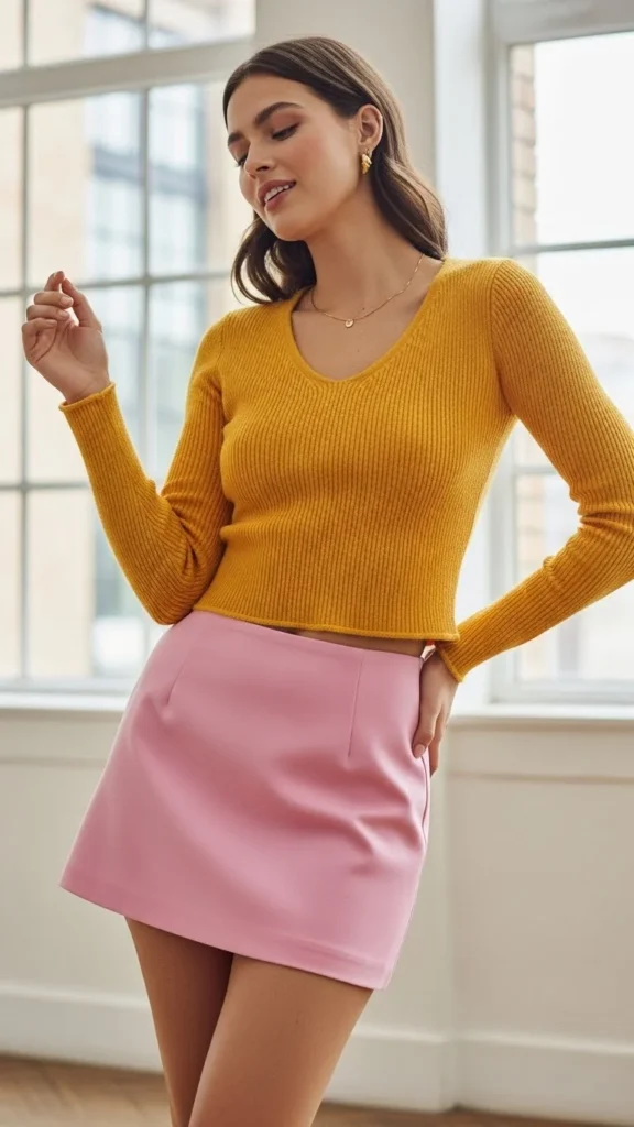 A pink mini skirt instantly sets a girly tone. Keep the top fitted to balance the shorter hem. Soft knits work best for comfort.