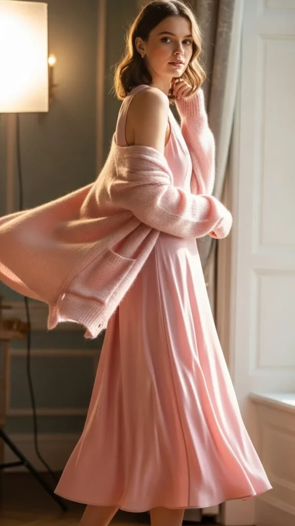 22. Pink Midi Dress With Soft Cardigan