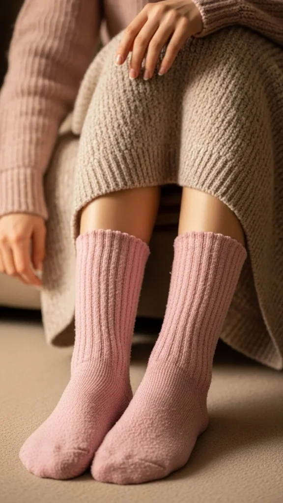 Sweater dresses feel soft and cute. Socks add a playful touch.