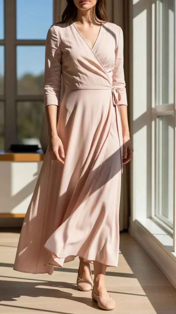 Wrap dresses feel soft and flattering. Blush tones keep things sweet.
