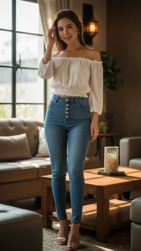 9. Off-Shoulder Top With High-Waist Jeans