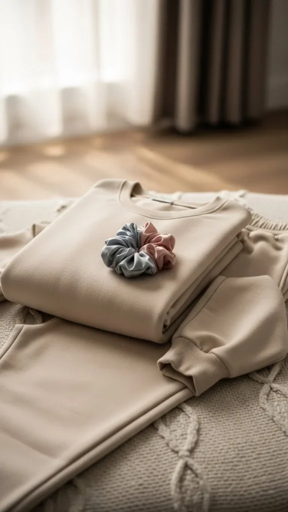 20. Neutral Sweat Set With Hair Scrunchie