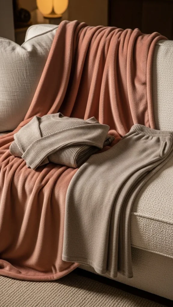26. Neutral Lounge Outfit With Soft Pink Blanket