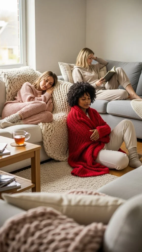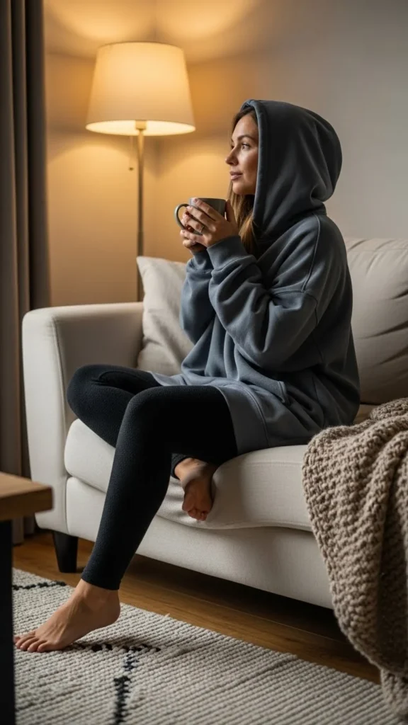 Oversized hoodies feel comforting. Fleece leggings add warmth.