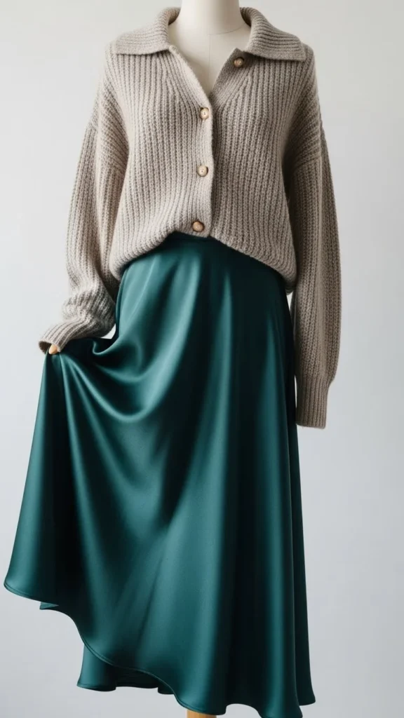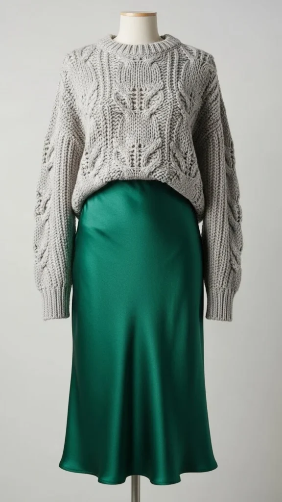A cozy sweater balances the smooth shine of a slip skirt. This pairing feels romantic without effort.