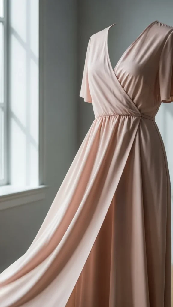 Wrap dresses feel flattering and adjustable. Blush tones add softness.