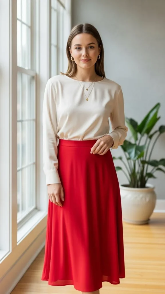 6. Red Midi Skirt With Neutral Top
