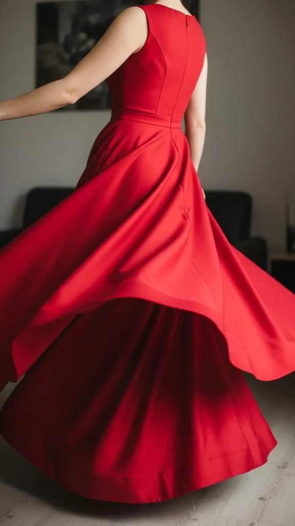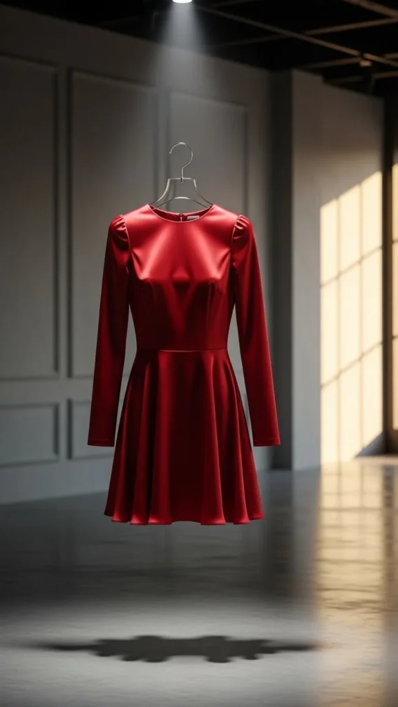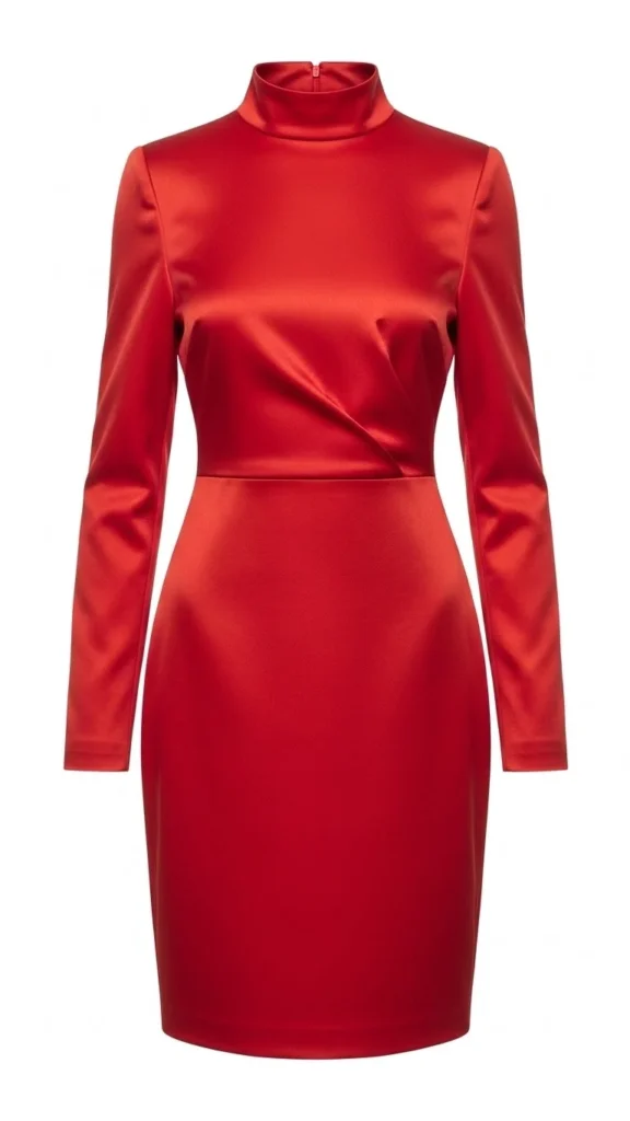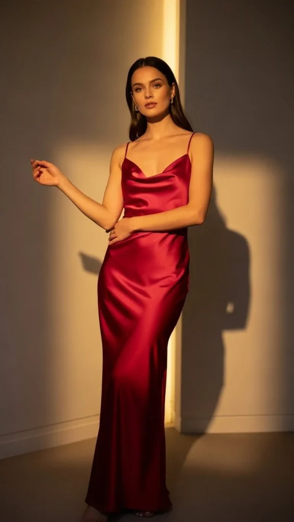 A red satin slip dress catches light beautifully. The smooth fabric moves with you and looks stunning in photos. Keep the cut simple with thin straps and a midi length.