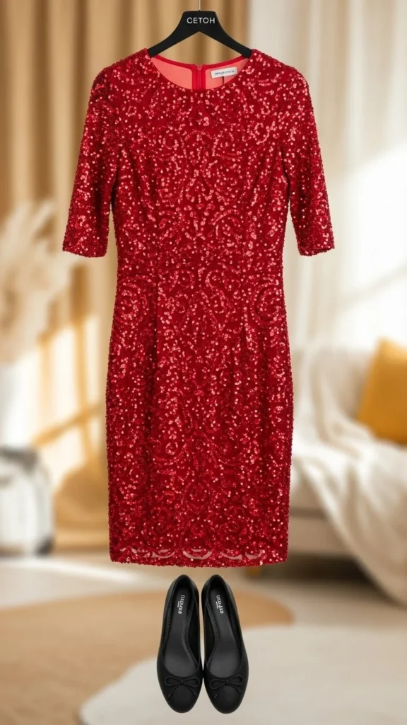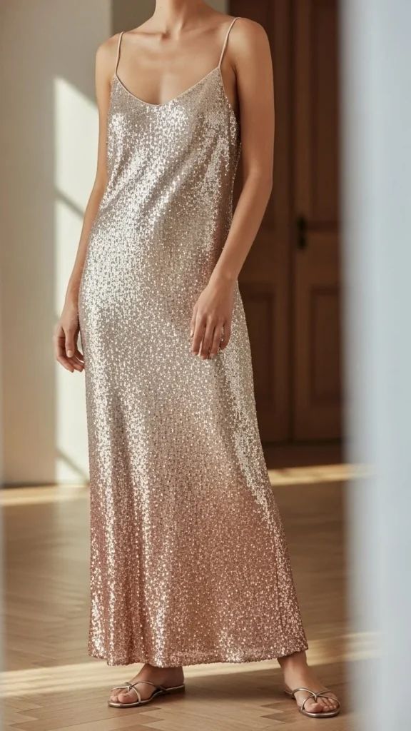 A slip dress covered in sequins feels bold but easy. Flats keep it wearable.