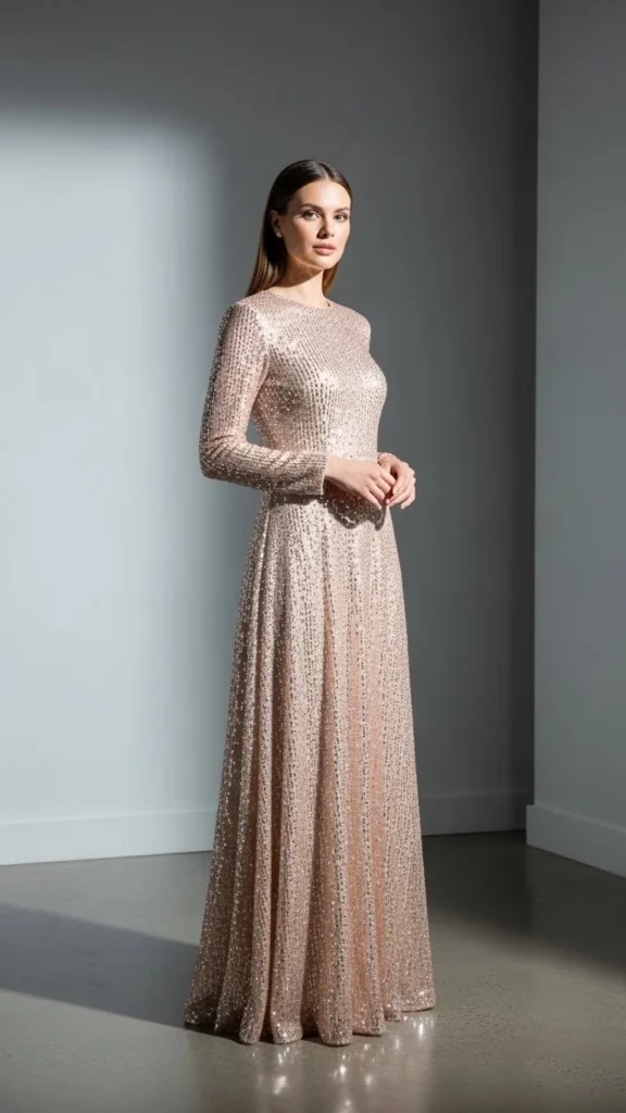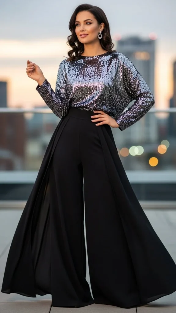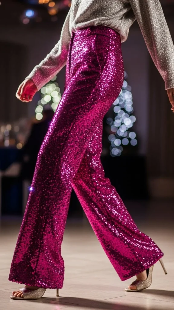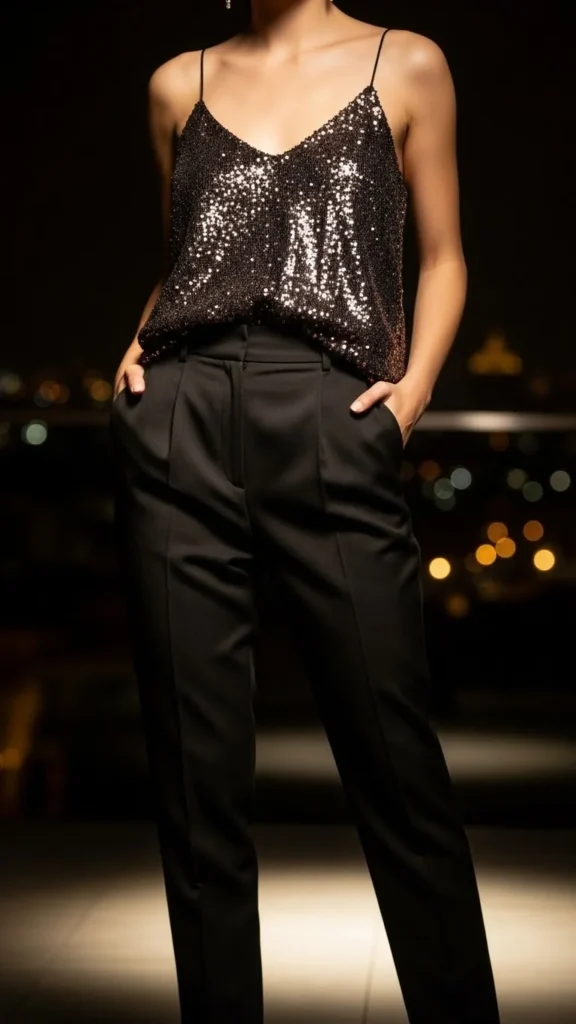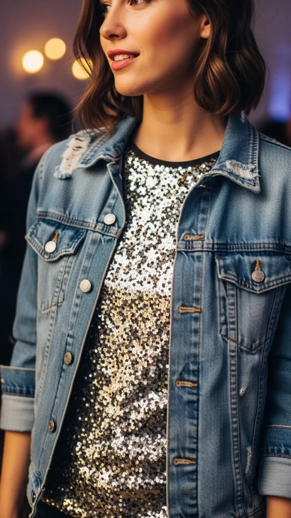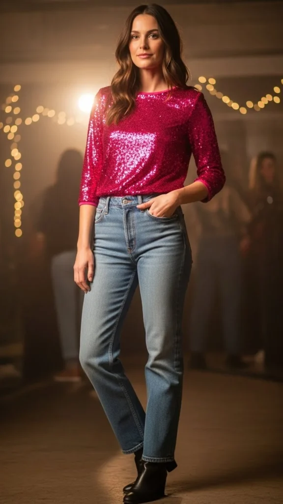 Sequins do not need a full dress. A sparkly top with jeans feels relaxed and modern.